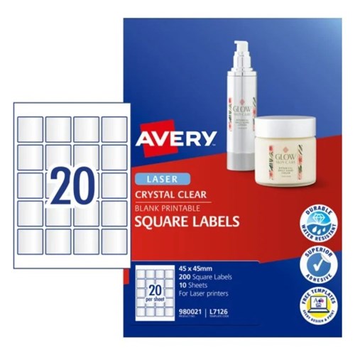 Avery Crystal Clear Labels L7126 45 x 45mm Square Clear 20UP 200 Labels 10 Sheets