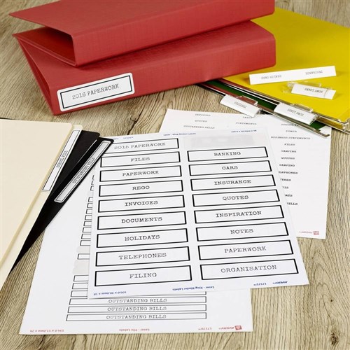 Specially designed labels to fit the spine of lever arch, ring binders, elasticated folders, box files, suspension files, document wallets and square cut folders.
