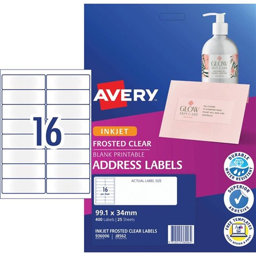 Avery Frosted Clear Inkjet Address Labels J8562 99.1x24mm 16UP 400 Labels