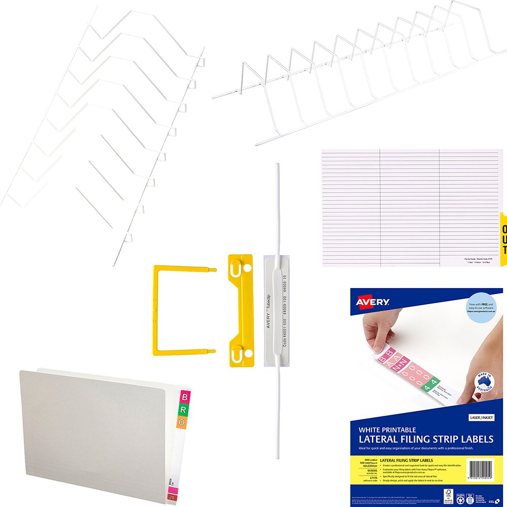 Includes 5 of 900X390mm File Racks, (40448), Straight Edge File Rack (40461), 600 Foolscap White Lateral Files (46503), 600 Tubeclip® Fasteners (44009Y), Outguides Pack Of 25 (41546) and 800 Avery Lateral Filing Labels (959095).