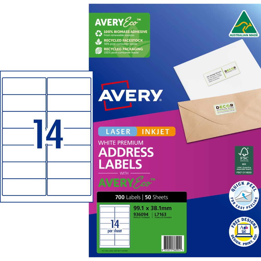 Avery Premium Address Labels White Laser Inkjet AveryEco L7163 99.1x38.1mm 14UP 700 Lab