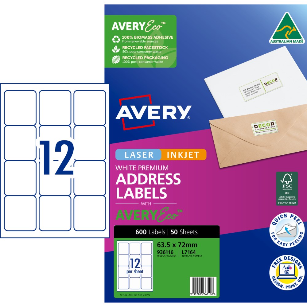 Avery Premium Address Labels White Laser Inkjet AveryEco L7164 63.5x72mm 12UP 600 Lab