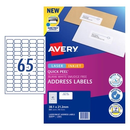 Size: 38.1x21.2mm 650 labels, 10 Sheets. 65 labels per sheet (65UP).