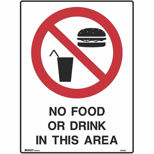 Brady Prohibition Sign No Food Or Drink In This Area 450W x 600mmH Metal White/Red/Black