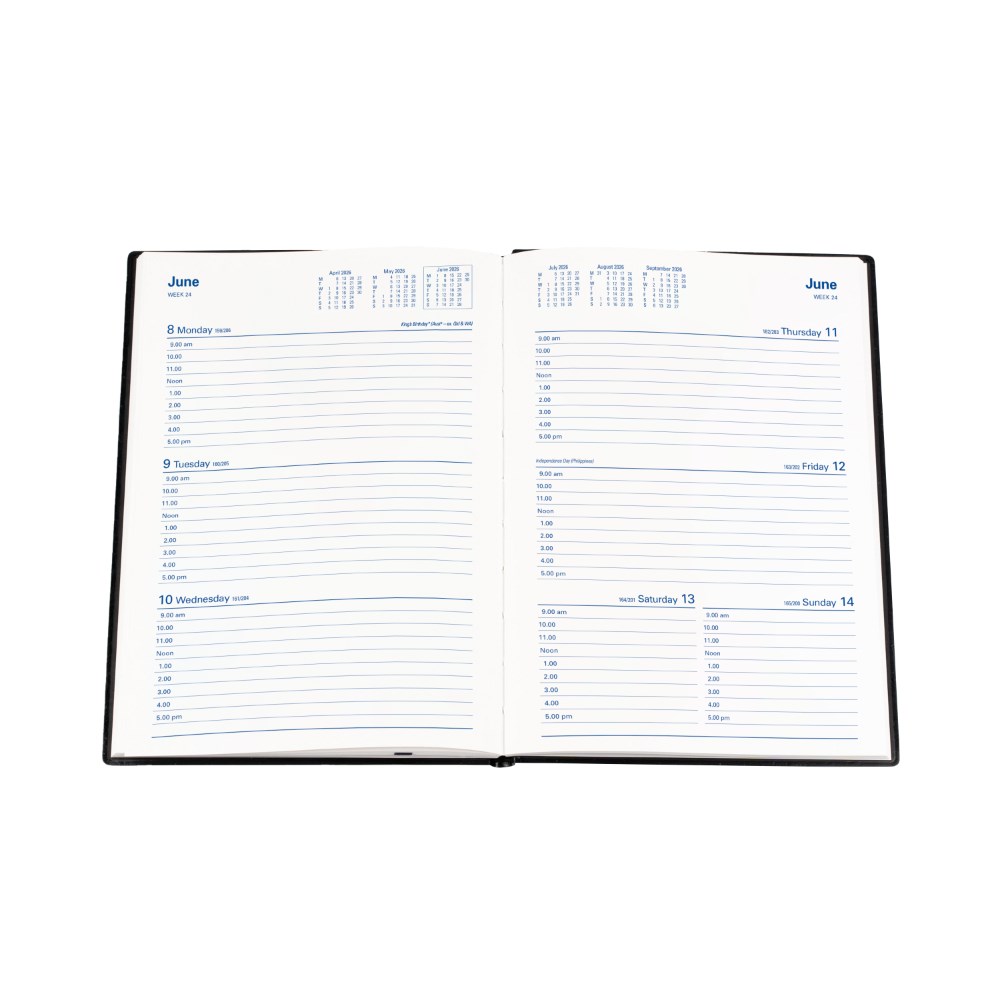 Bound in a highly durable, welded PVC padded cover. Printed on white paper, week numbers and Julian days.