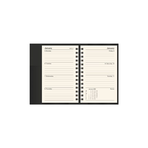 Pen loop, lay flat opening, ribbon marker and week to view layout.