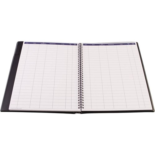 Wiro bound corporate visitors book with padded PVC cover, 64 sheets and pen loop.