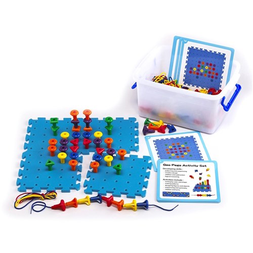 Set includes 4 EVA foam boards that can be joined together, 144 pegs in 6 colors, 12 laces and 12 double sided activity cards in a sturdy plastic container.