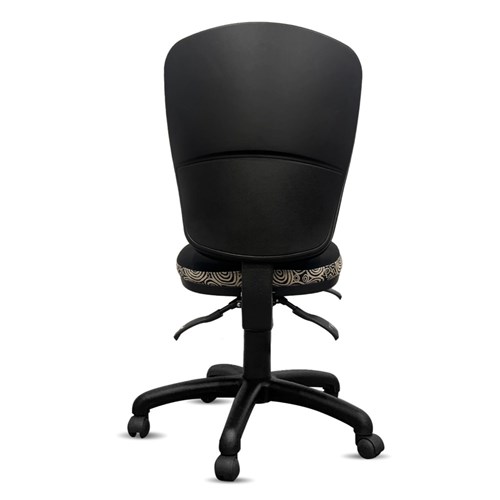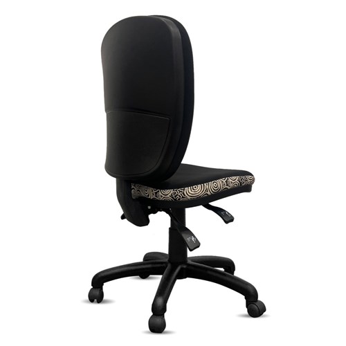 A unique commercial fabrics designed by Nelly Patterson (Indigenous Artist) combined with K2 Black Fabric to upholster the chair.