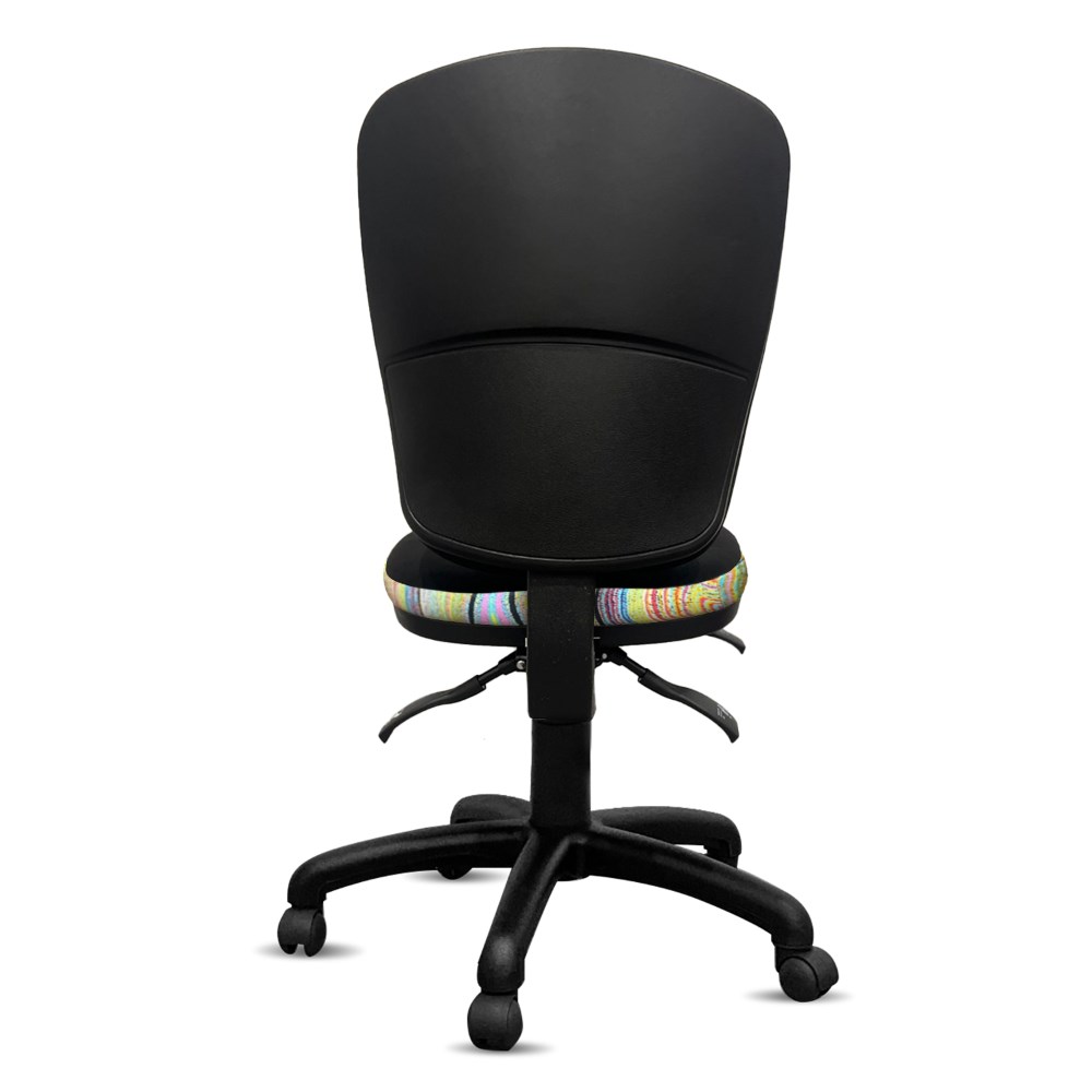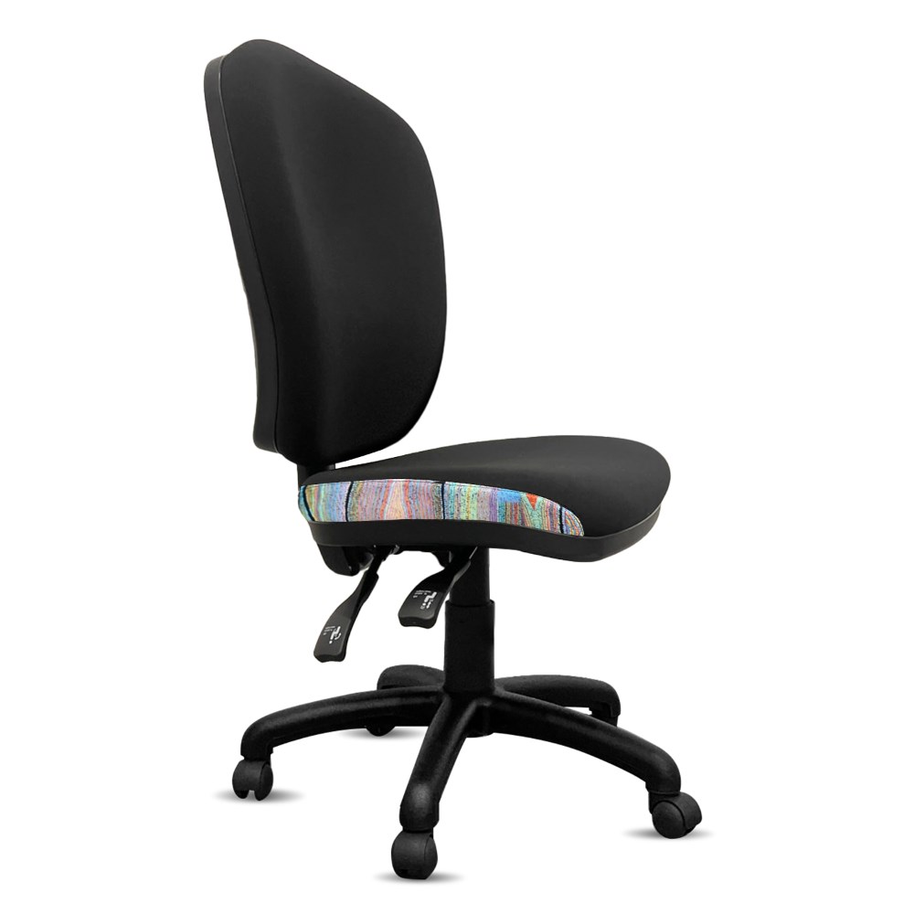 Heavy duty commercial chair with 3 lever mechanism and ratchet back height adjustment.