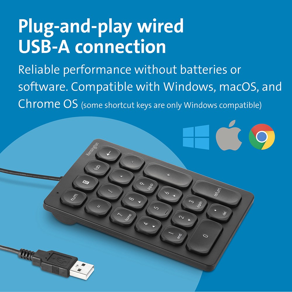21-Key number pad with four shortcut keys is a smart addition to a laptop or keyboard that is not equipped with a number pad. Shortcut keys allow frequently used commands with the press of a button (some shortcut keys are only Windows compatible).