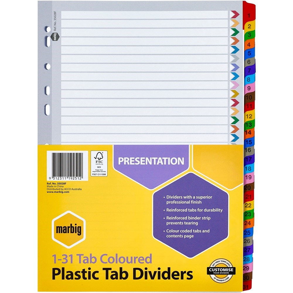 Marbig Plastic Indices & Dividers A4 Reinforced 1-31 Tab Multi Colour