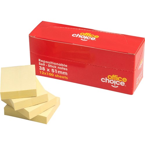 Office Choice Repositionable Sticky Notes 100 sheets Yellow 38 x 51mm Pack of 12