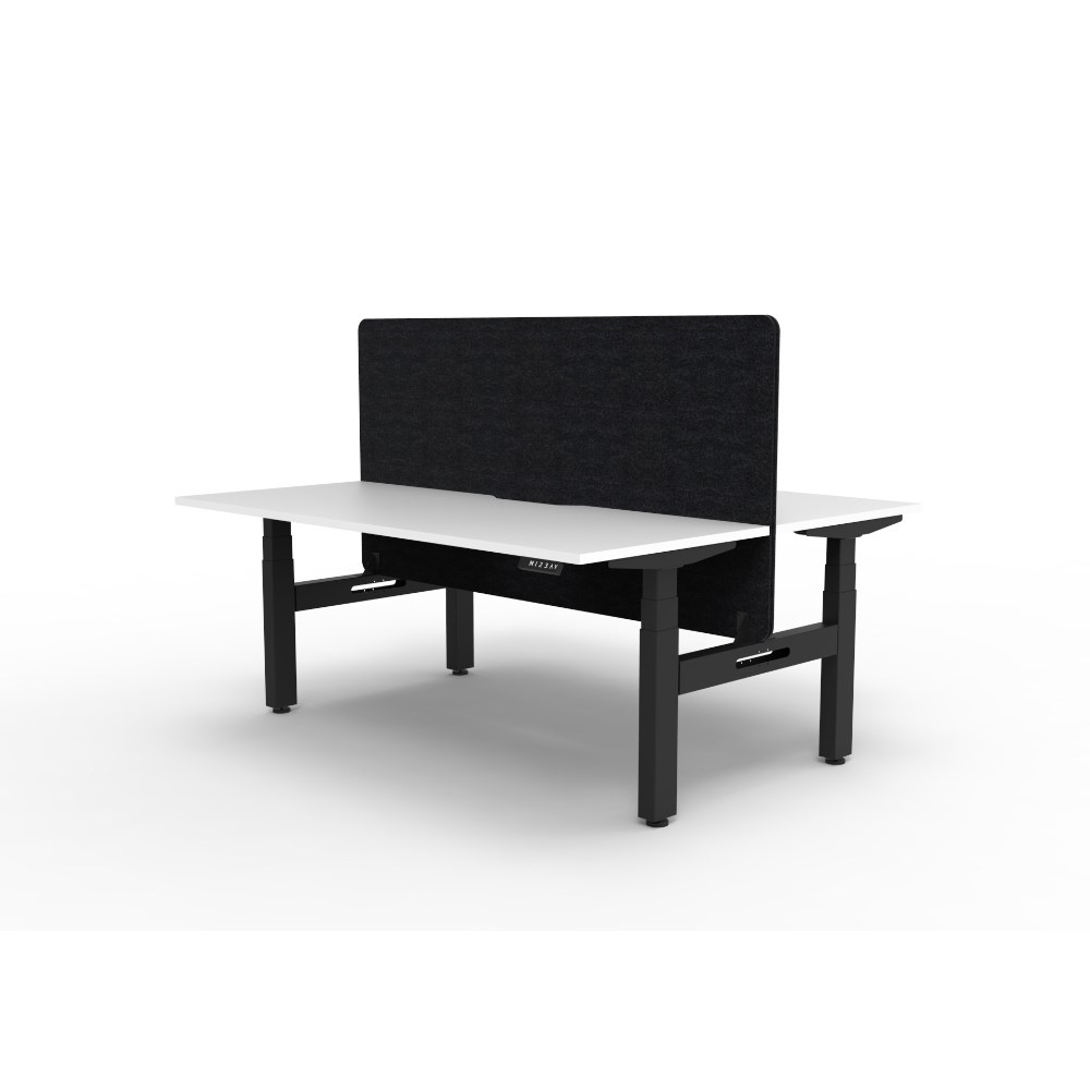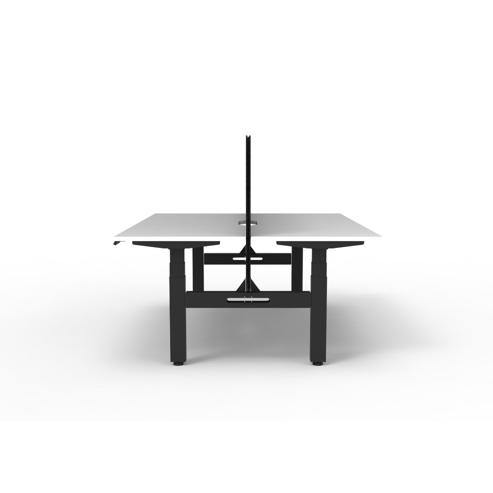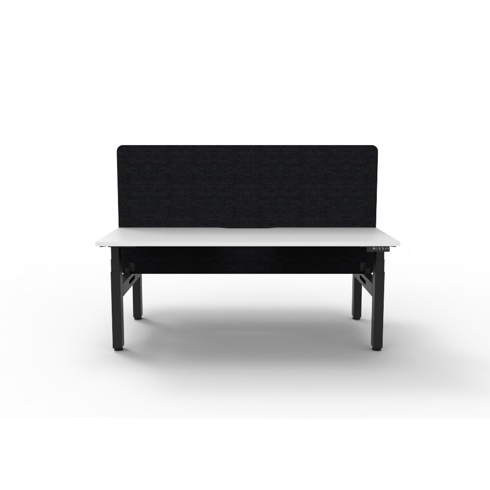 Natural White worksurface with rigid edging and 50mm scallop cable cut out. E0 rated 25mm top. Black Satin powder coat underframe. Eco screen.