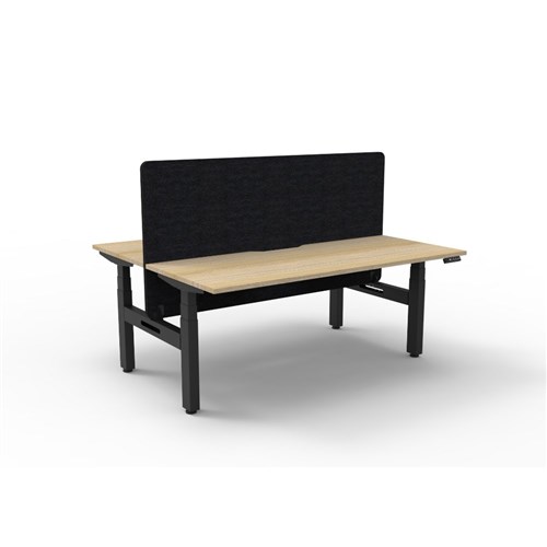 Natural Oak worksurface with rigid edging and 50mm scallop cable cut out. E0 rated 25mm top. Black Satin powder coat underframe. Eco screen.