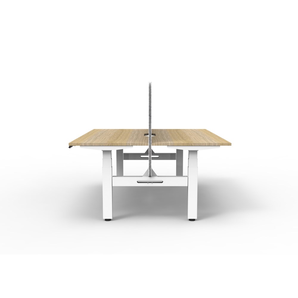 Natural Oak worksurface with rigid edging and 50mm scallop cable cut out. E0 rated 25mm top. White Satin powder coat underframe. Eco screen.