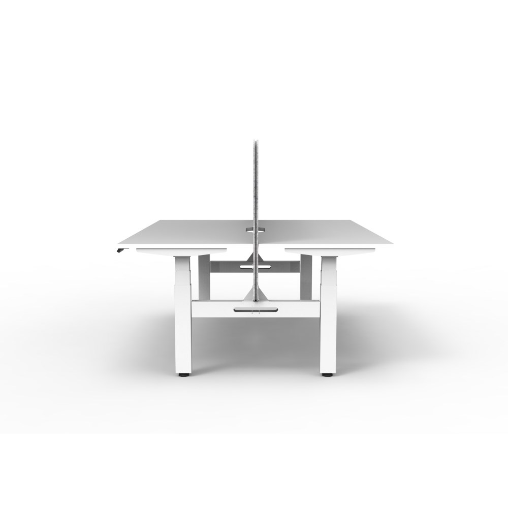 Natural White worksurface with rigid edging and 50mm scallop cable cut out. E0 rated 25mm top. White Satin powder coat underframe. Eco screen.