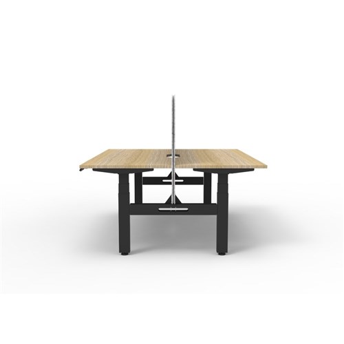 Natural Oak worksurface with rigid edging and 50mm scallop cable cut out. E0 rated 25mm top. Black Satin powder coat underframe. Eco screen.