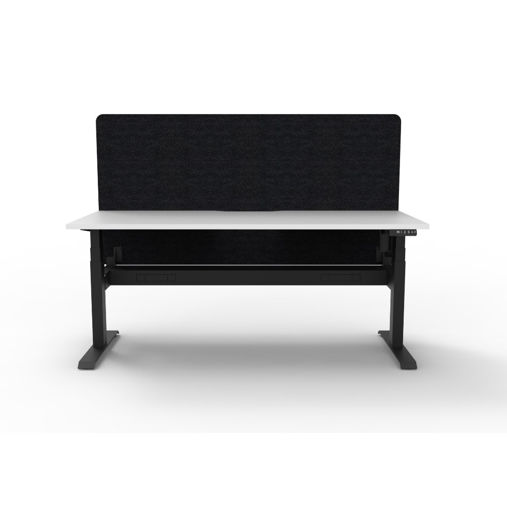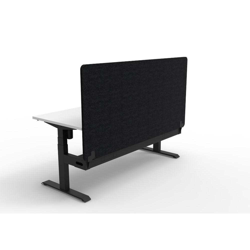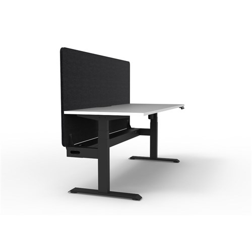 Electric height adjustable single sided workstation with Natural White top and Black Satin frame, Black Eco screen and cable tray.