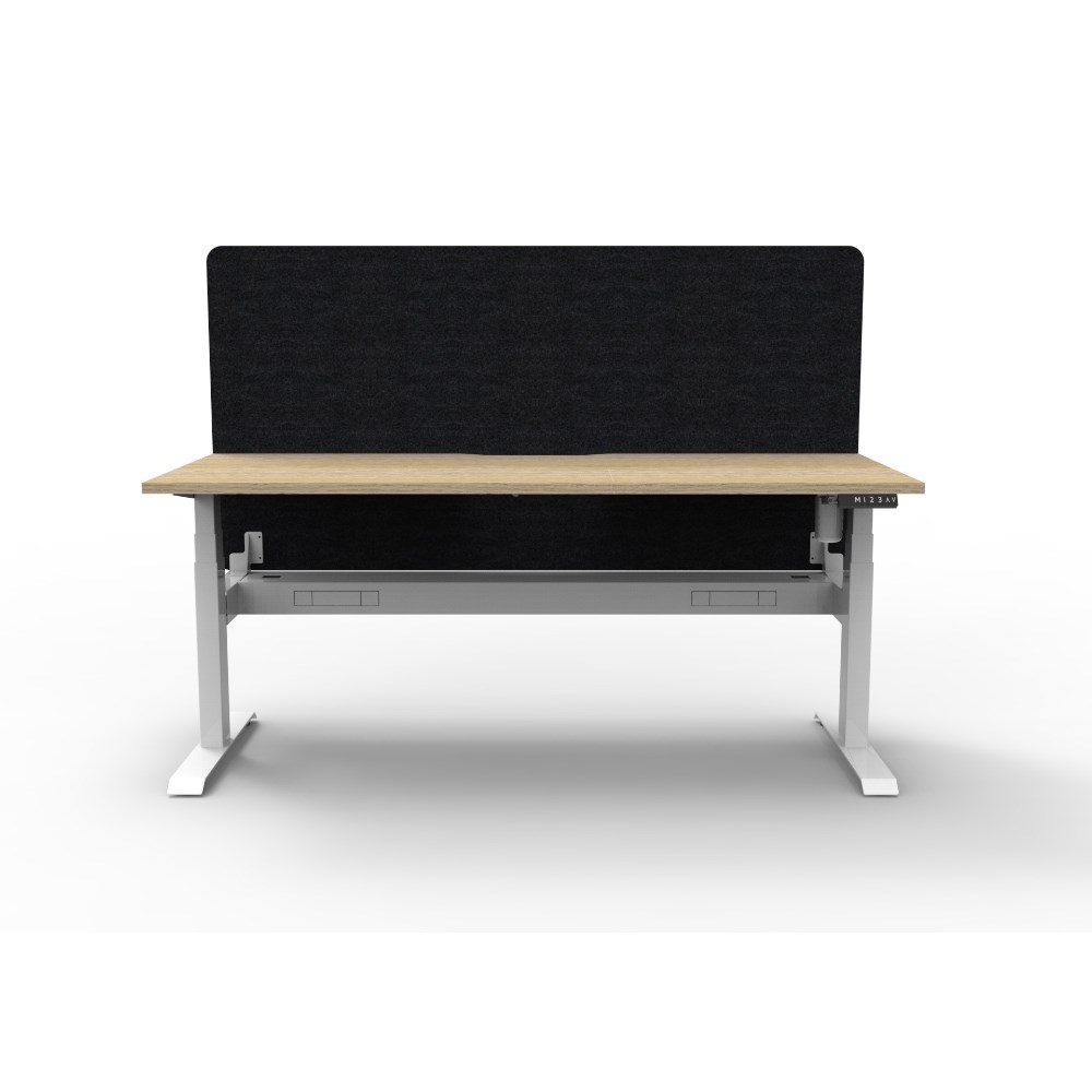 Electric height adjustable single sided workstation with Natural Oak top and White Satin frame, Black Eco screen and cable tray.