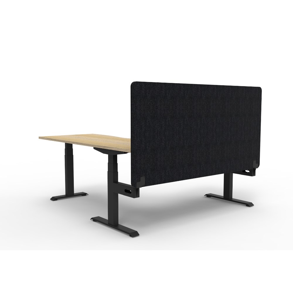 Manual crank height adjustable corner workstation with Natural Oak top and Black Satin frame, Black Eco screen.