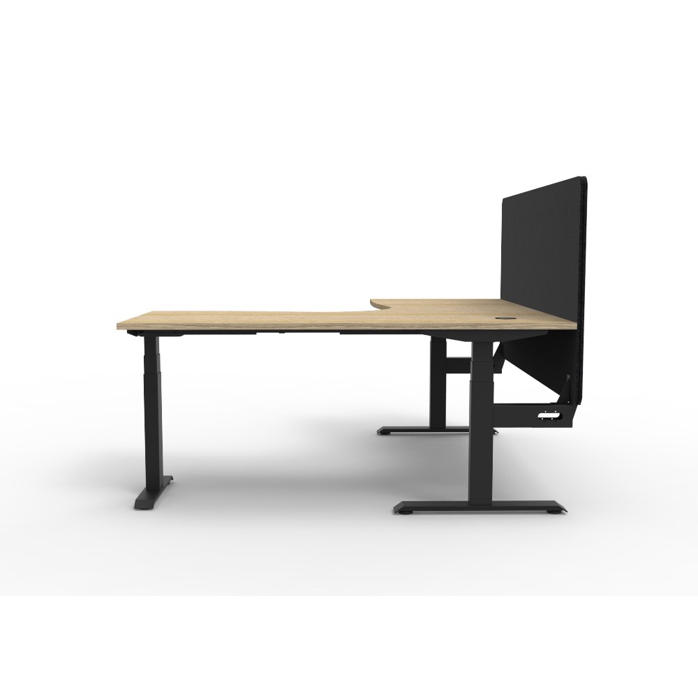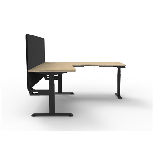 Manual crank height adjustable corner workstation with Natural Oak top and Black Satin frame, Black Eco screen.