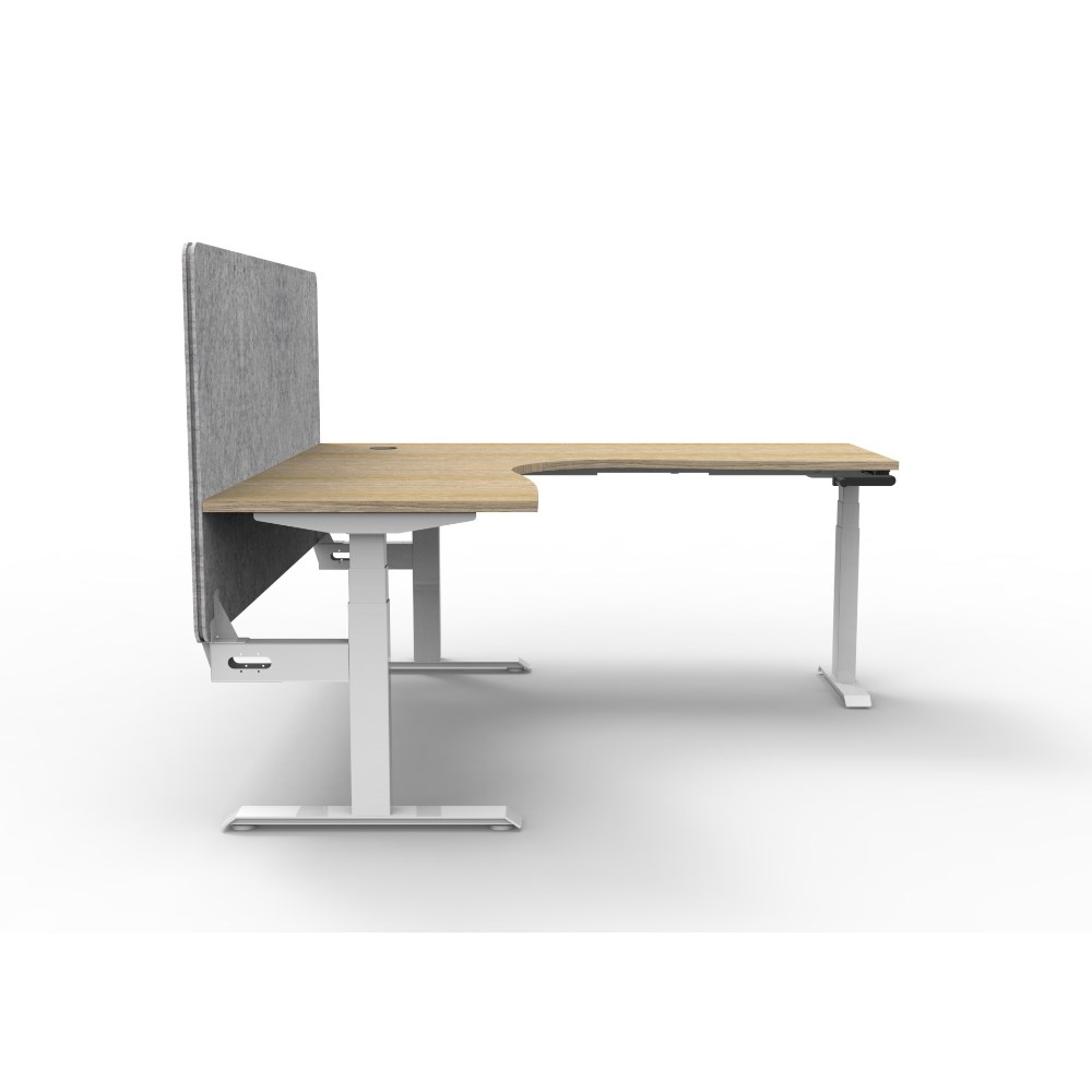 Manual crank height adjustable corner workstation with Natural Oak top and White Satin frame, Grey Eco screen.