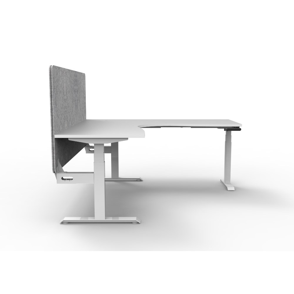 Manual crank height adjustable corner workstation with Natural White top and White Satin frame, Grey Eco screen.