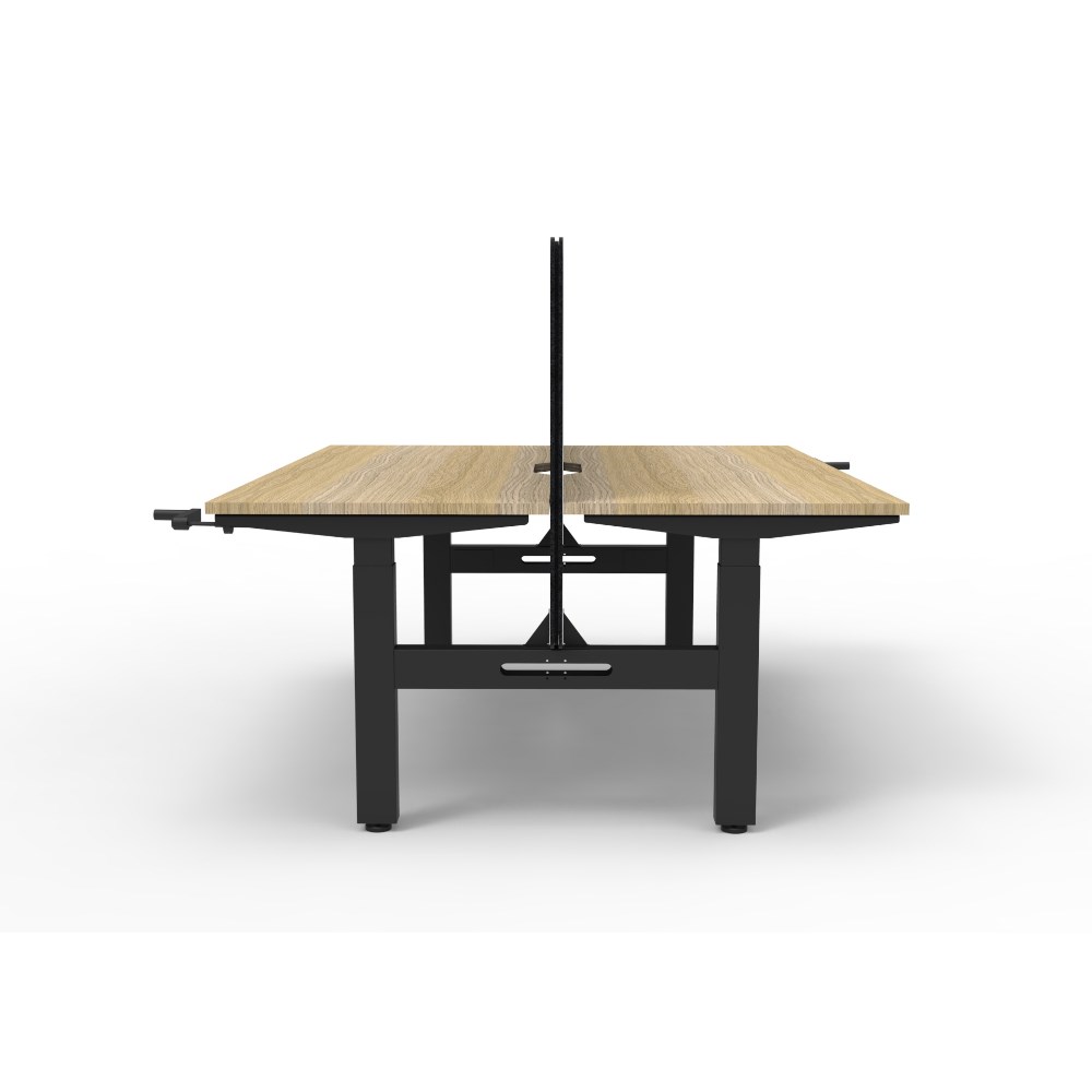 Manual crank height adjustable 2 person back to back workstation with Natural Oak top and Black Satin frame, Black Eco screen.