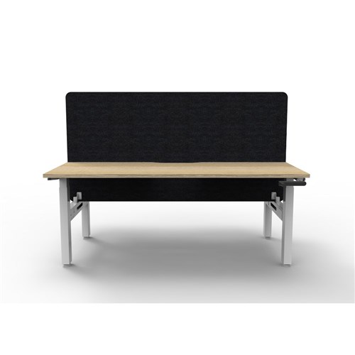 Manual crank height adjustable 2 person back to back workstation with Natural Oak top and White Satin frame, Black Eco screen.