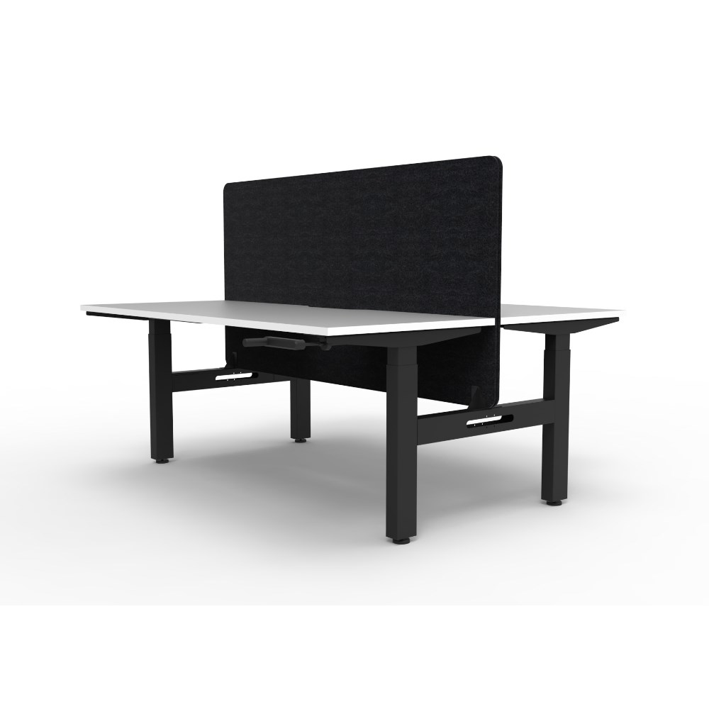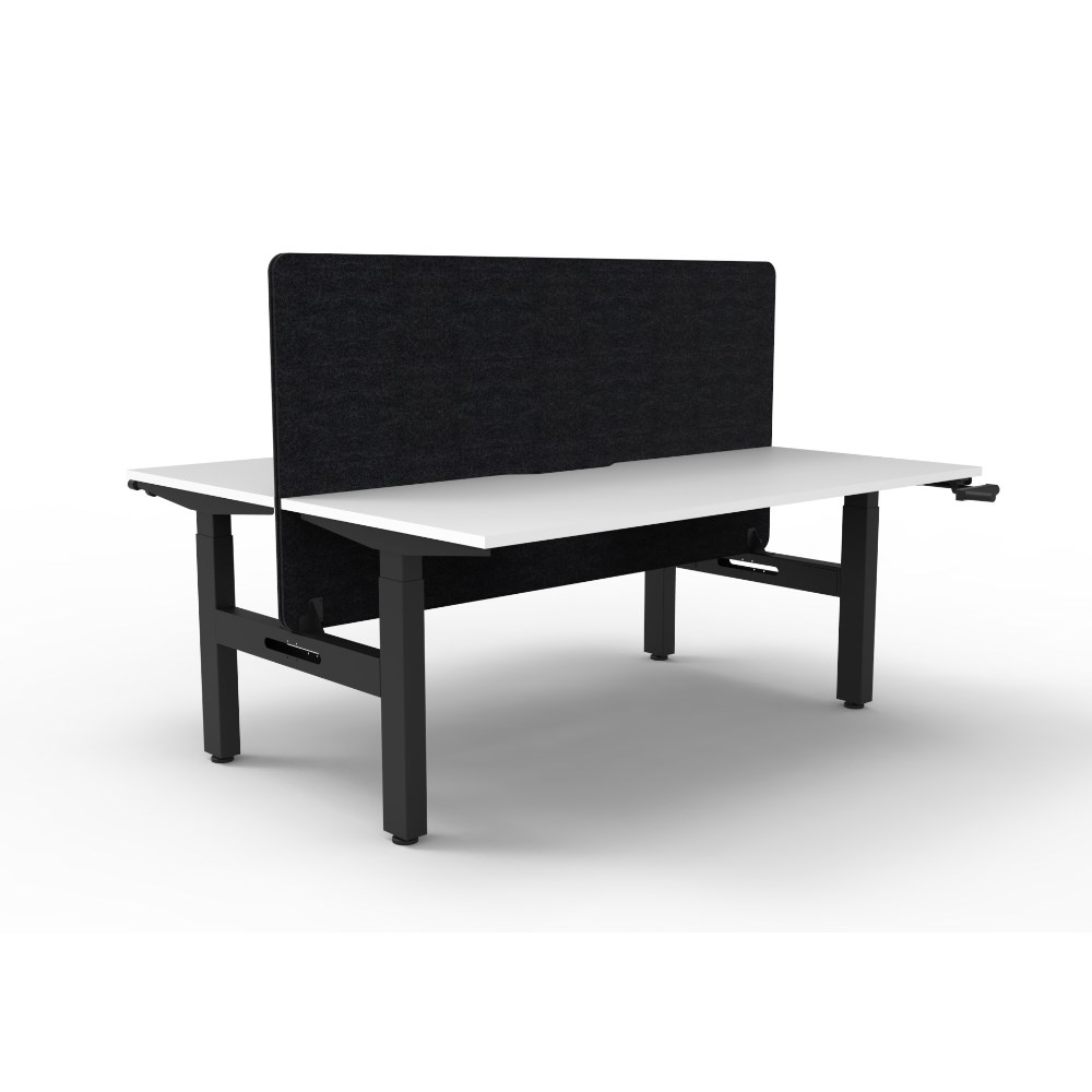 Manual crank height adjustable 2 person back to back workstation with Natural White top and Black Satin frame, Black Eco screen.