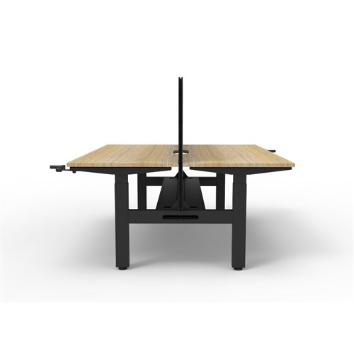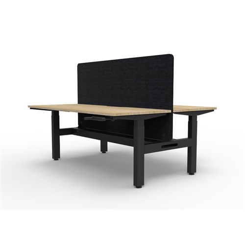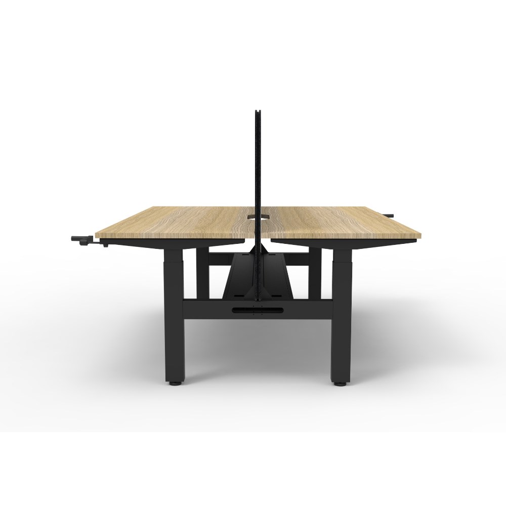 Manual crank height adjustable 2 person back to back workstation with Natural Oak top and Black Satin frame, Black Eco screen and cable tray.