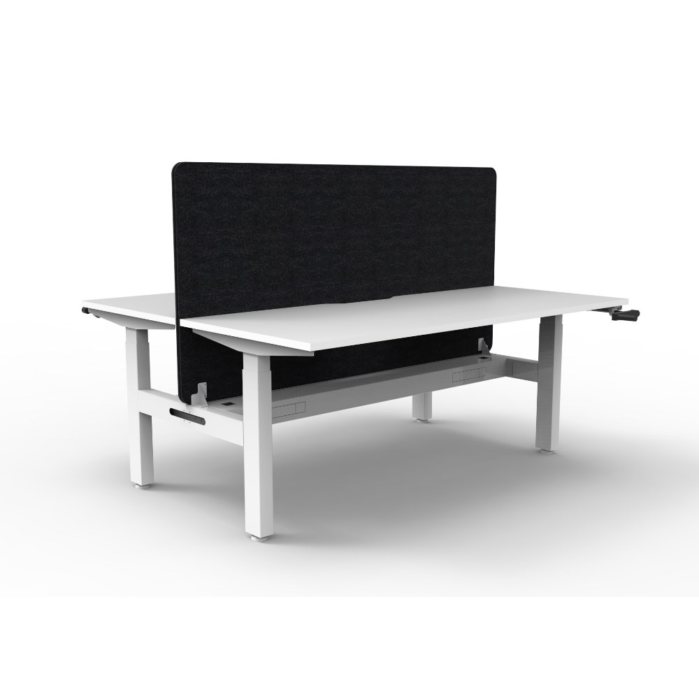 Manual crank height adjustable 2 person back to back workstation with Natural White top and White Satin frame, Black Eco screen and cable tray.