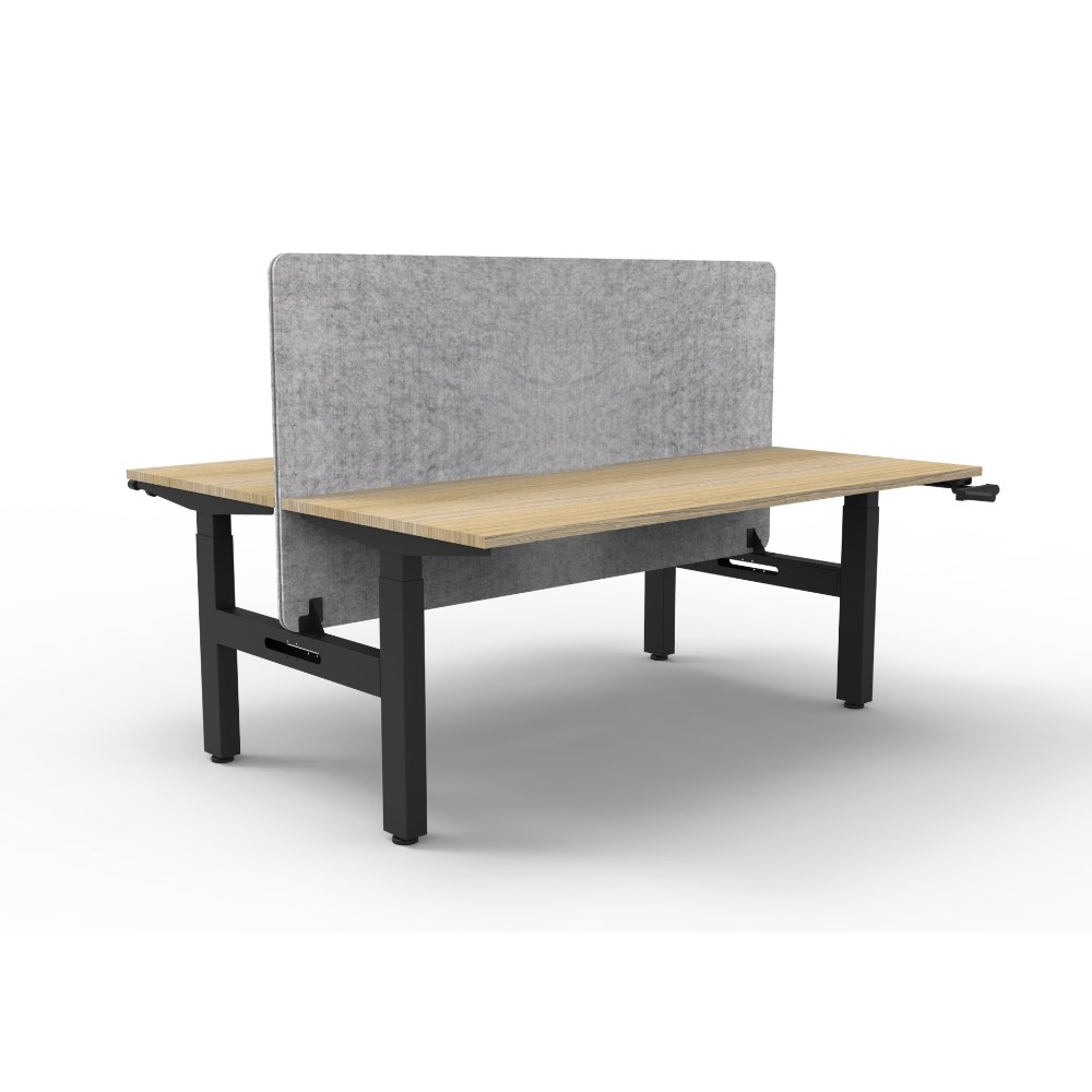 Manual crank height adjustable single sided workstation with Natural Oak top and Black Satin frame, Grey Eco screen.