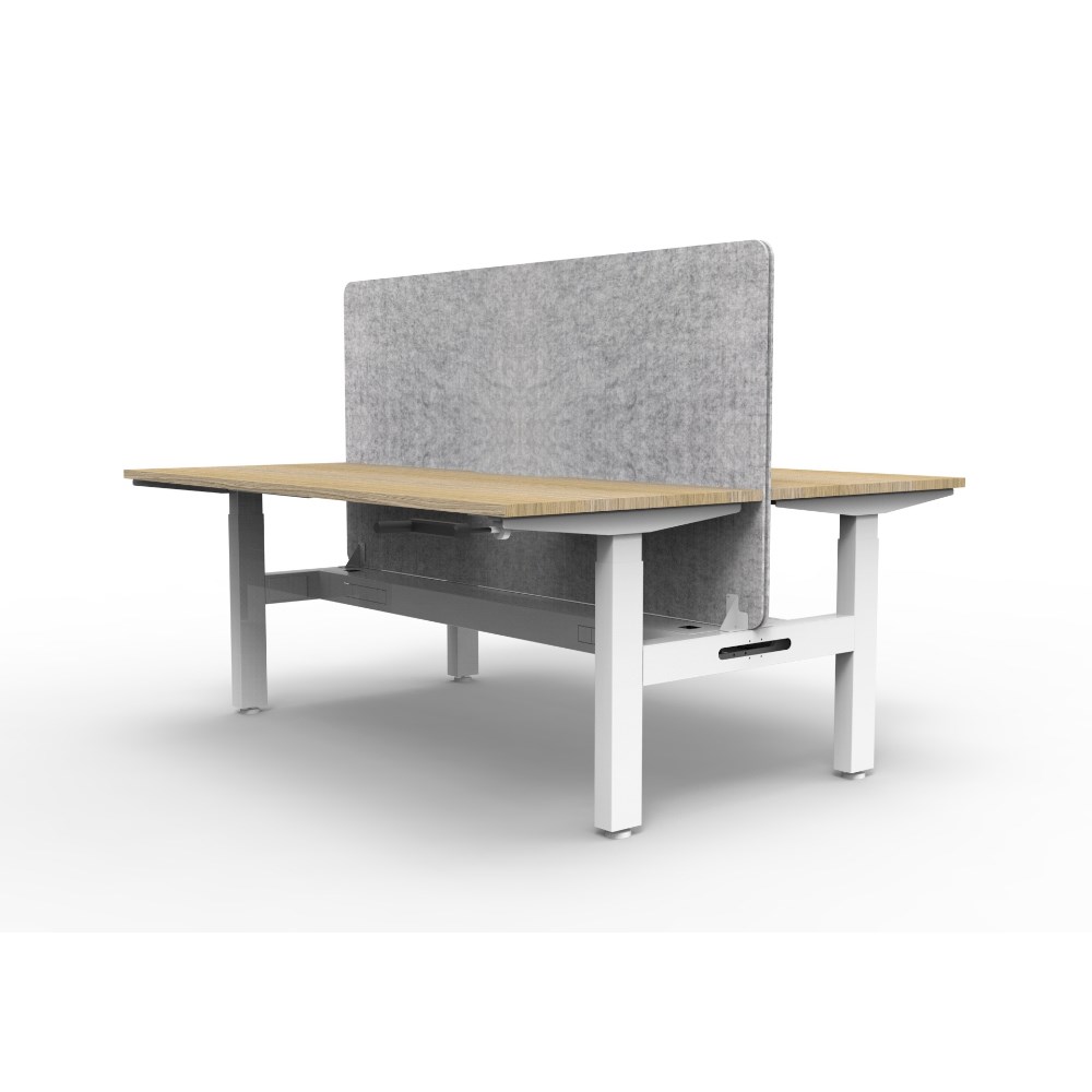 Manual crank height adjustable 2 person back to back workstation with Natural Oak top and White Satin frame, Grey Eco screen and cable tray.