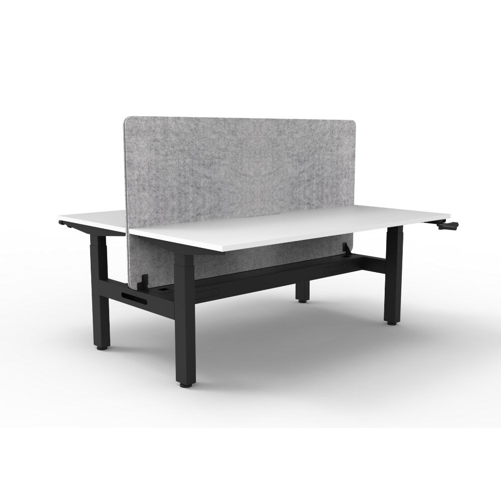 Manual crank height adjustable 2 person back to back workstation with Natural White top and Black Satin frame, Grey Eco screen and cable tray.