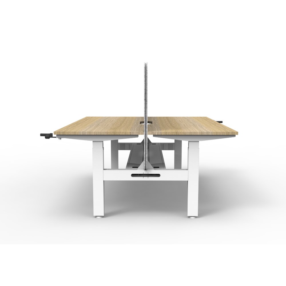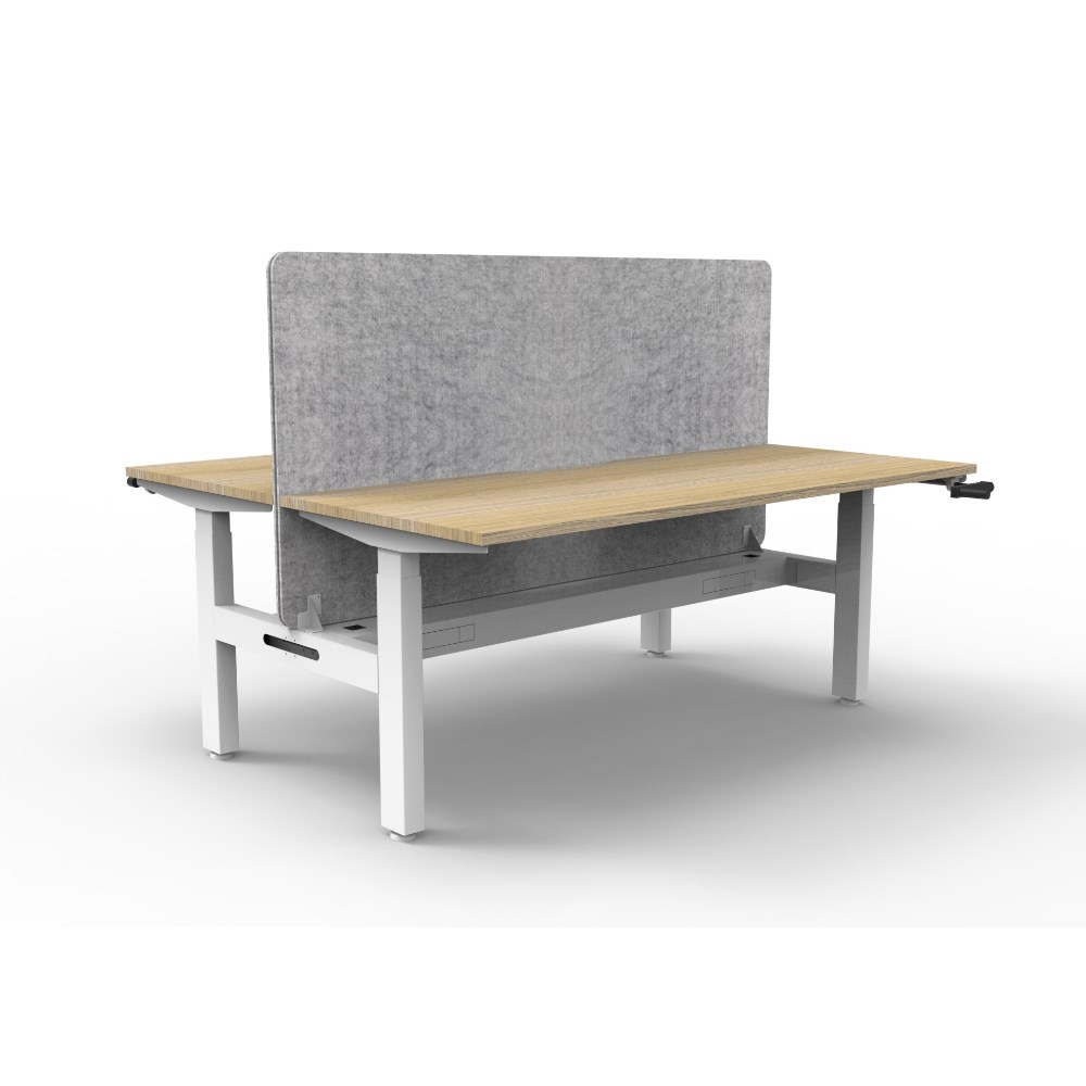 Manual crank height adjustable 2 person back to back workstation with Natural Oak top and White Satin frame, Grey Eco screen and cable tray.