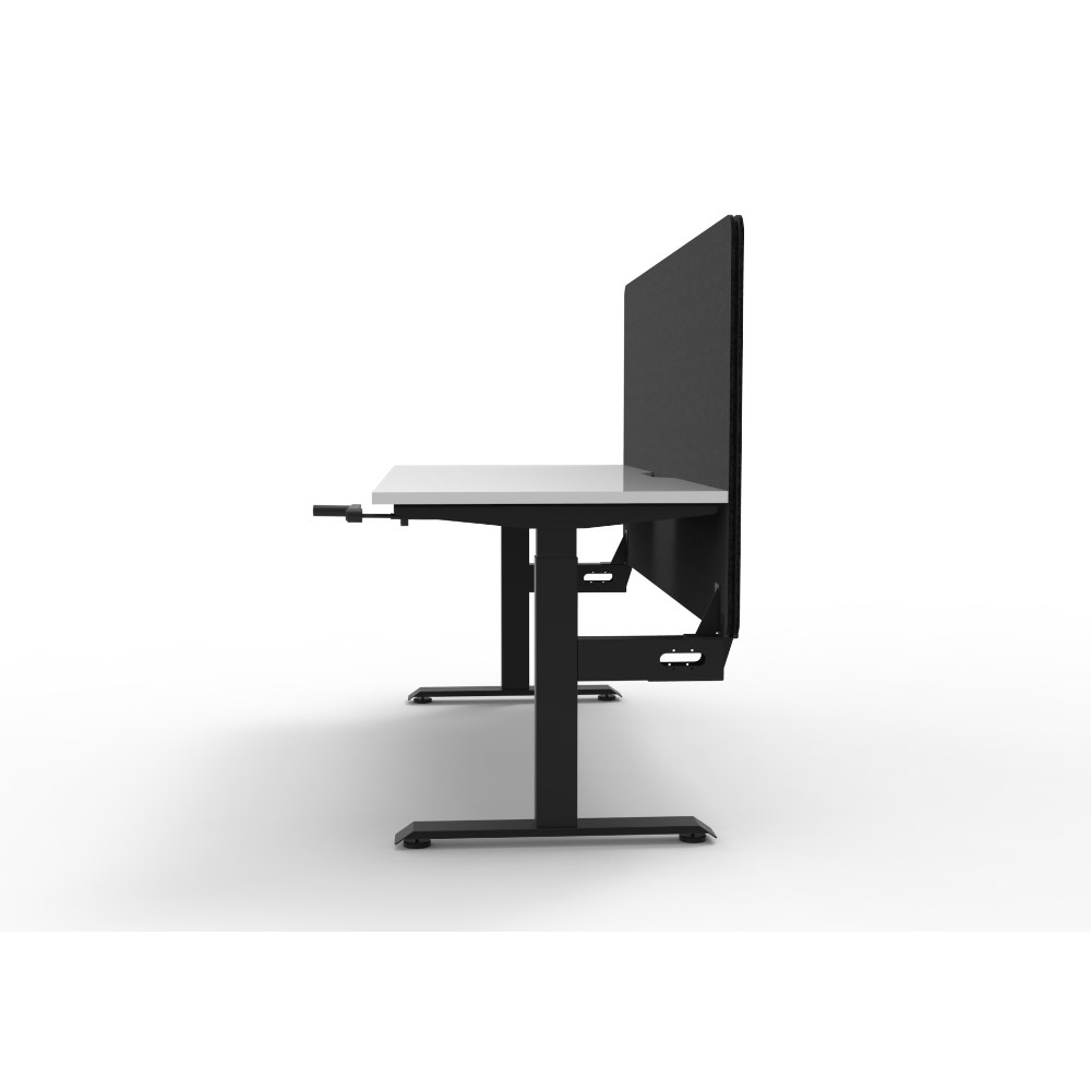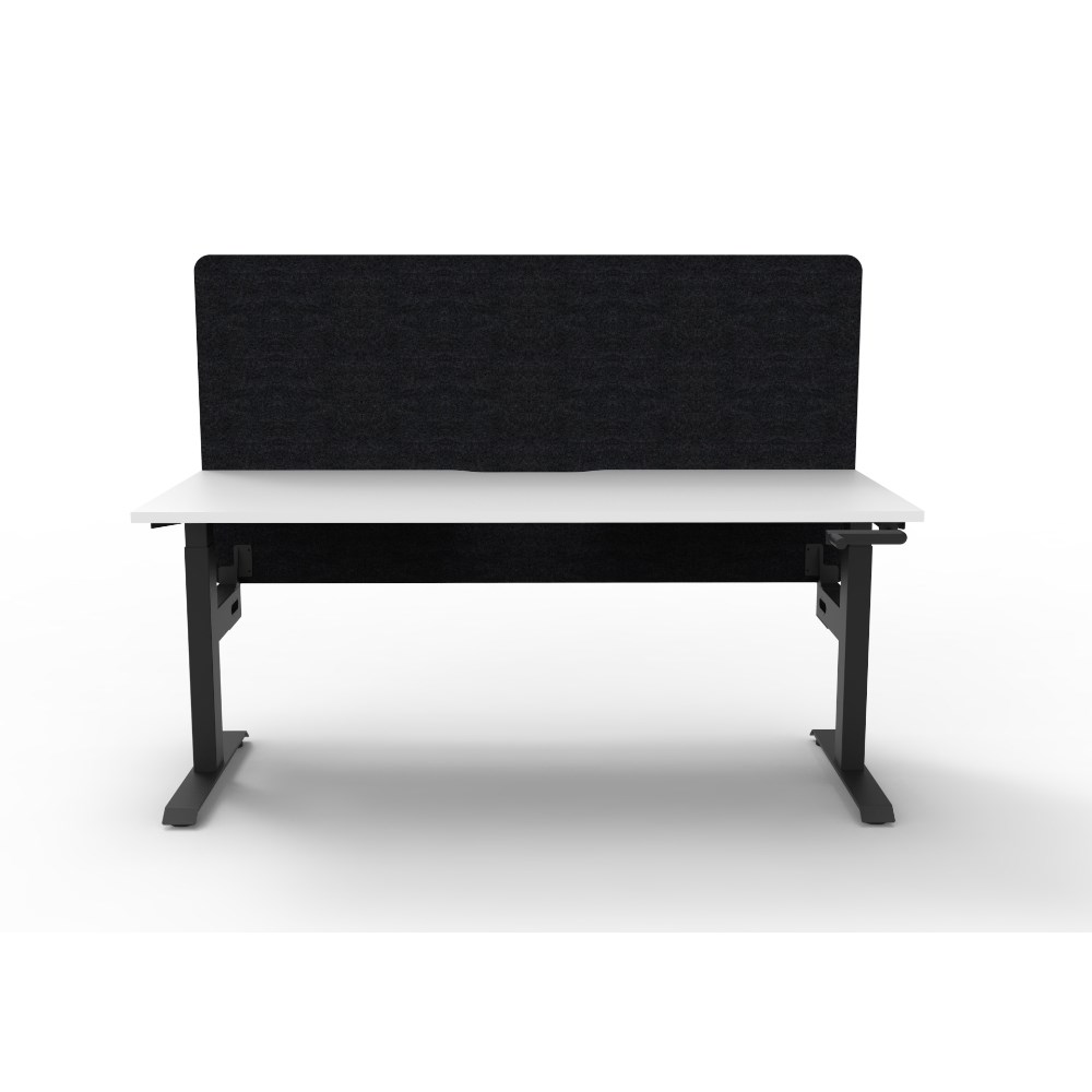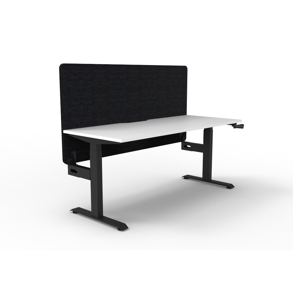 Manual crank height adjustable single sided workstation with Natural White top and Black Satin frame, Black Eco screen.
