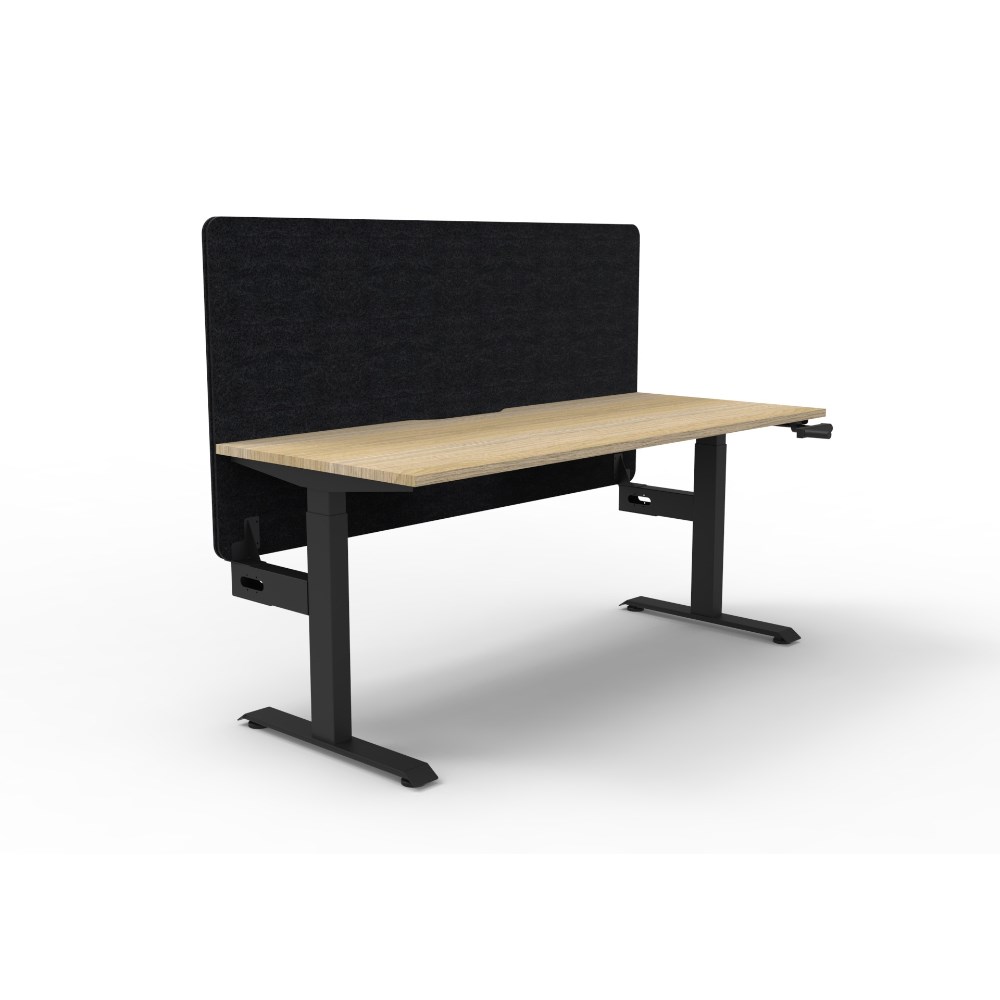 Manual crank height adjustable single sided workstation with Natural Oak top and Black Satin frame, Black Eco screen.