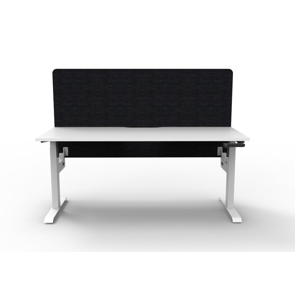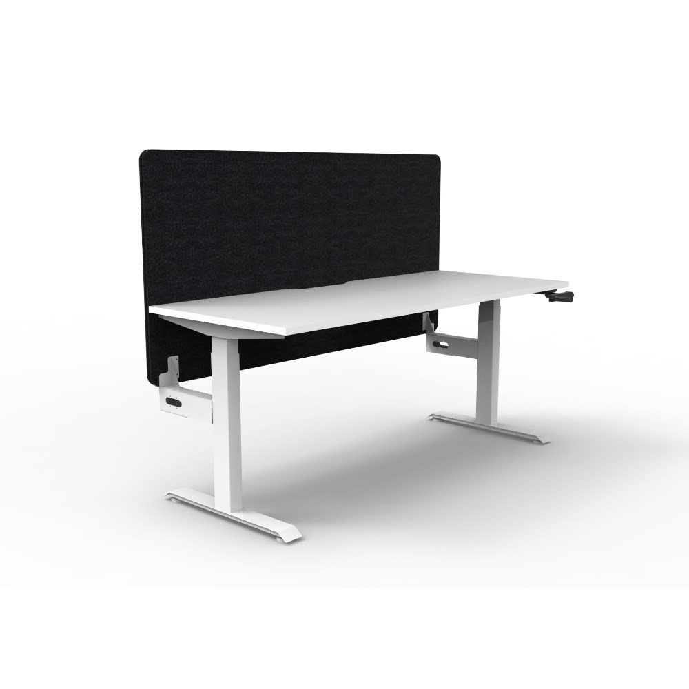 Manual crank height adjustable single sided workstation with Natural White top and White Satin frame, Black Eco screen.