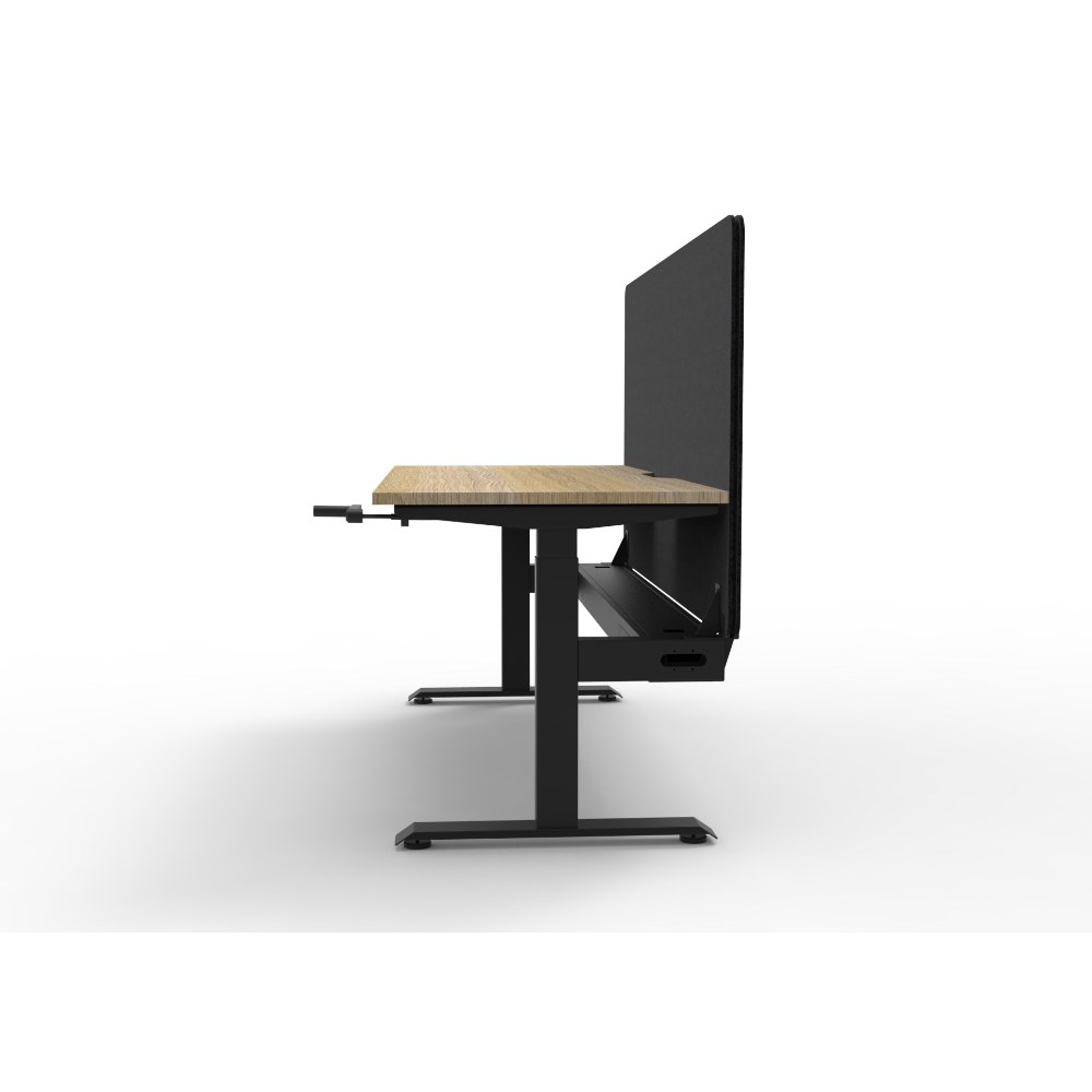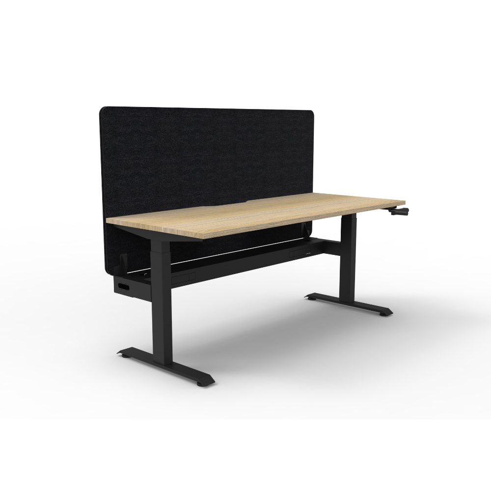 Manual crank height adjustable single sided workstation with Natural Oak top and Black Satin frame, Black Eco screen and cable tray.