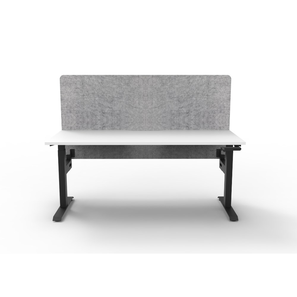 Manual crank height adjustable single sided workstation with Natural White top and Black Satin frame, Grey Eco screen.