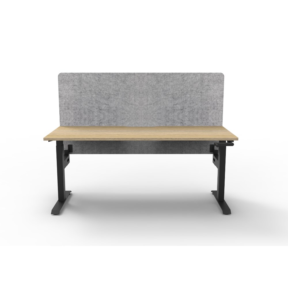 Manual crank height adjustable single sided workstation with Natural Oak top and Black Satin frame, Grey Eco screen.