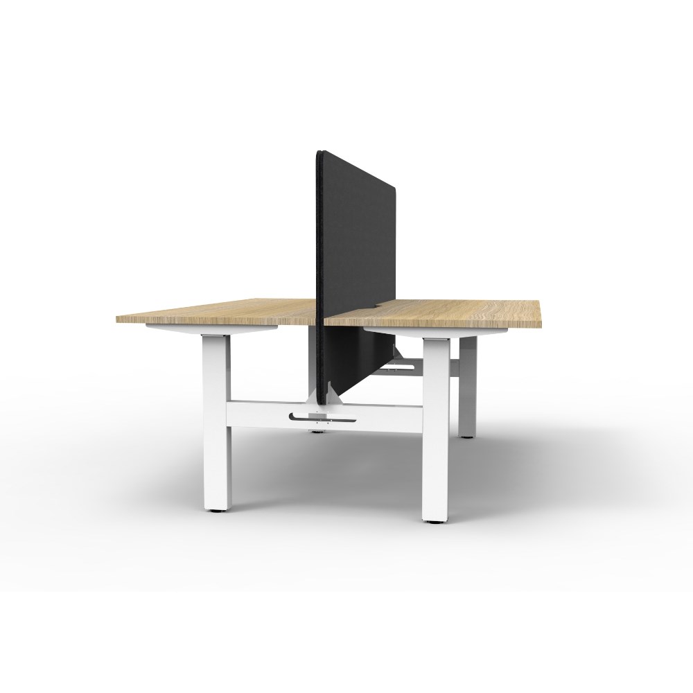 2 person back to back workstation with Natural Oak top and White Satin frame, Black Eco screen.