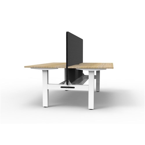 2 person back to back workstation with Natural Oak top and White Satin frame, Black Eco screen and cable tray.