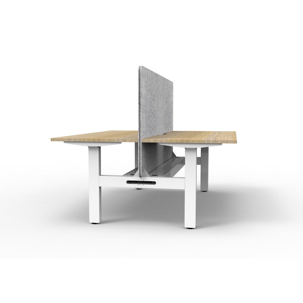 2 person back to back workstation with Natural Oak top and White Satin frame, Grey Eco screen and cable tray.
