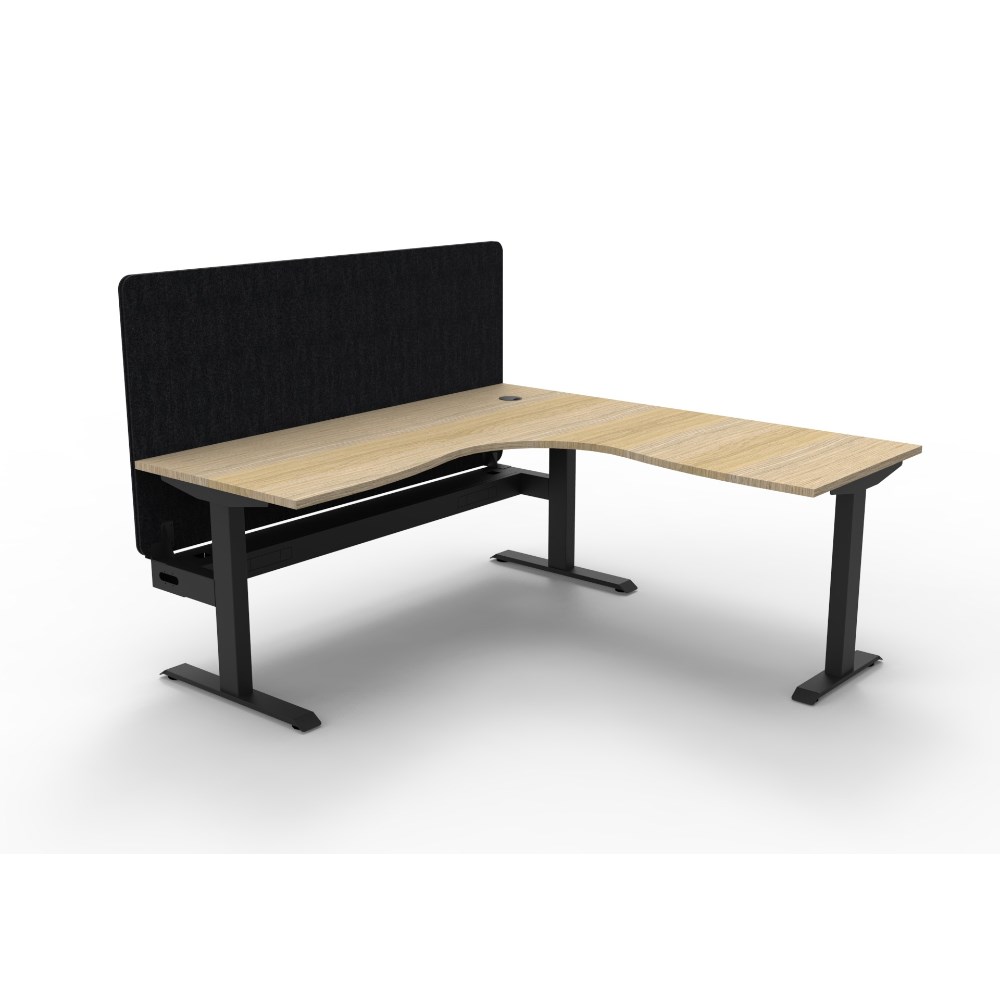 Corner workstation with Natural Oak top and Black Satin frame, Black Eco screen and cable tray.