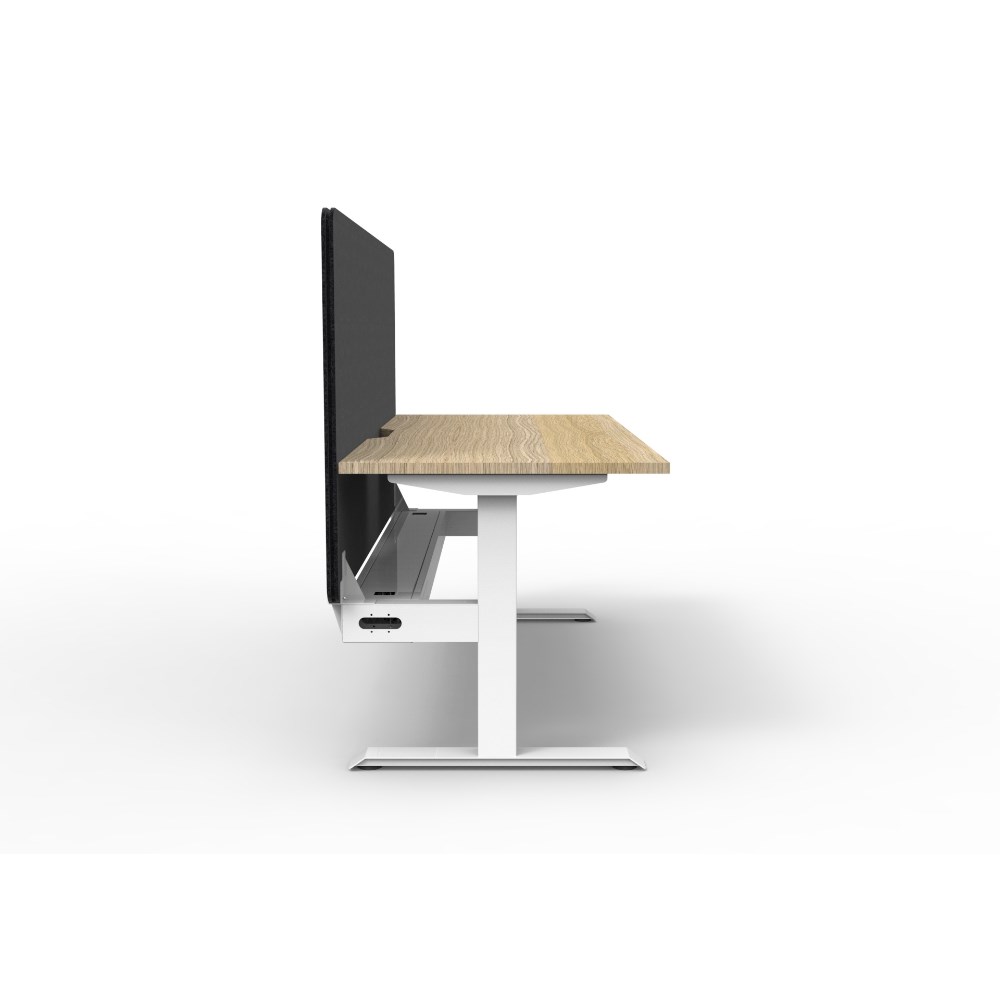 Single sided workstation with Natural Oak top and White Satin frame, Black Eco screen and cable tray.