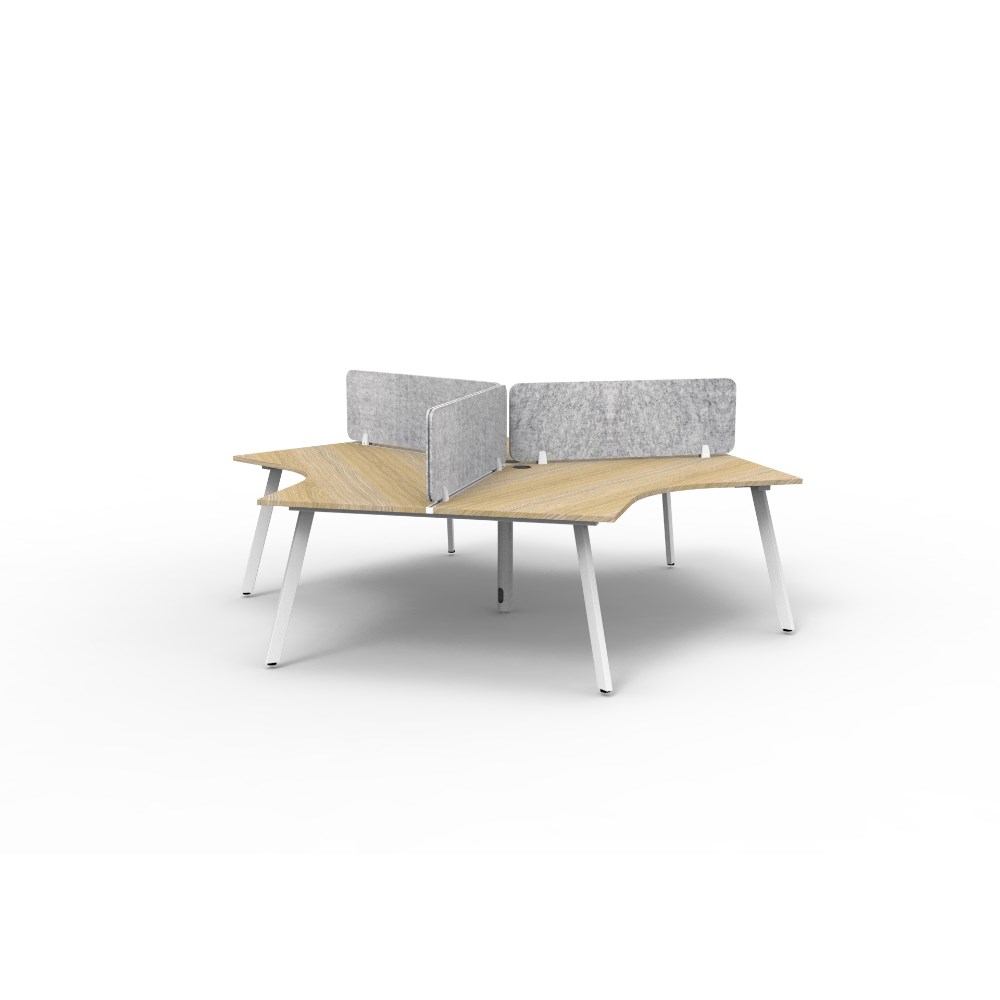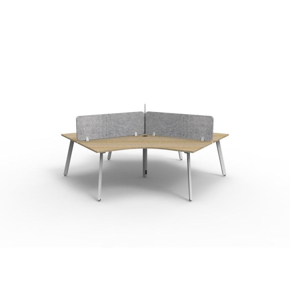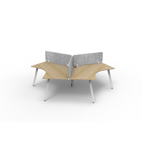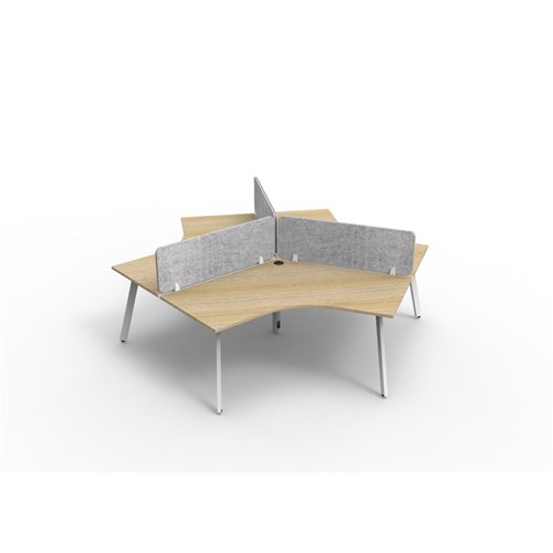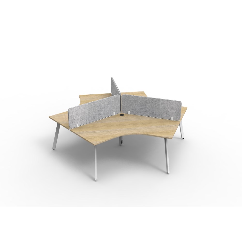 3 person 120 degree workstation with Natural Oak top and White Satin frame, Grey Eco screen.