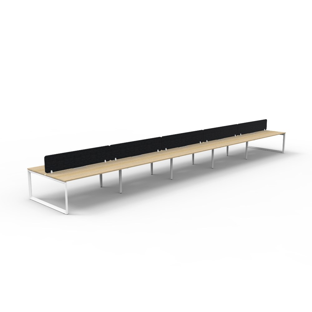 10 person double sided workstation with Natural Oak top and White Satin frame, Black Eco screen.